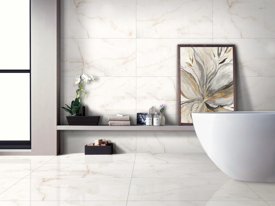 Its high-gloss finish enhances the natural veining, where delicate golden streaks dance across a luminous white background, capturing the elegance of premium marble. Designed for indoor use, the tile’s reflective surface amplifies light and creates an impression of spaciousness, making it ideal for living rooms, kitchens, bathrooms, and feature walls. Combining timeless beauty with the strength and easy maintenance of porcelain, it delivers a sophisticated, high-end aesthetic suited for both modern and classic interiors.